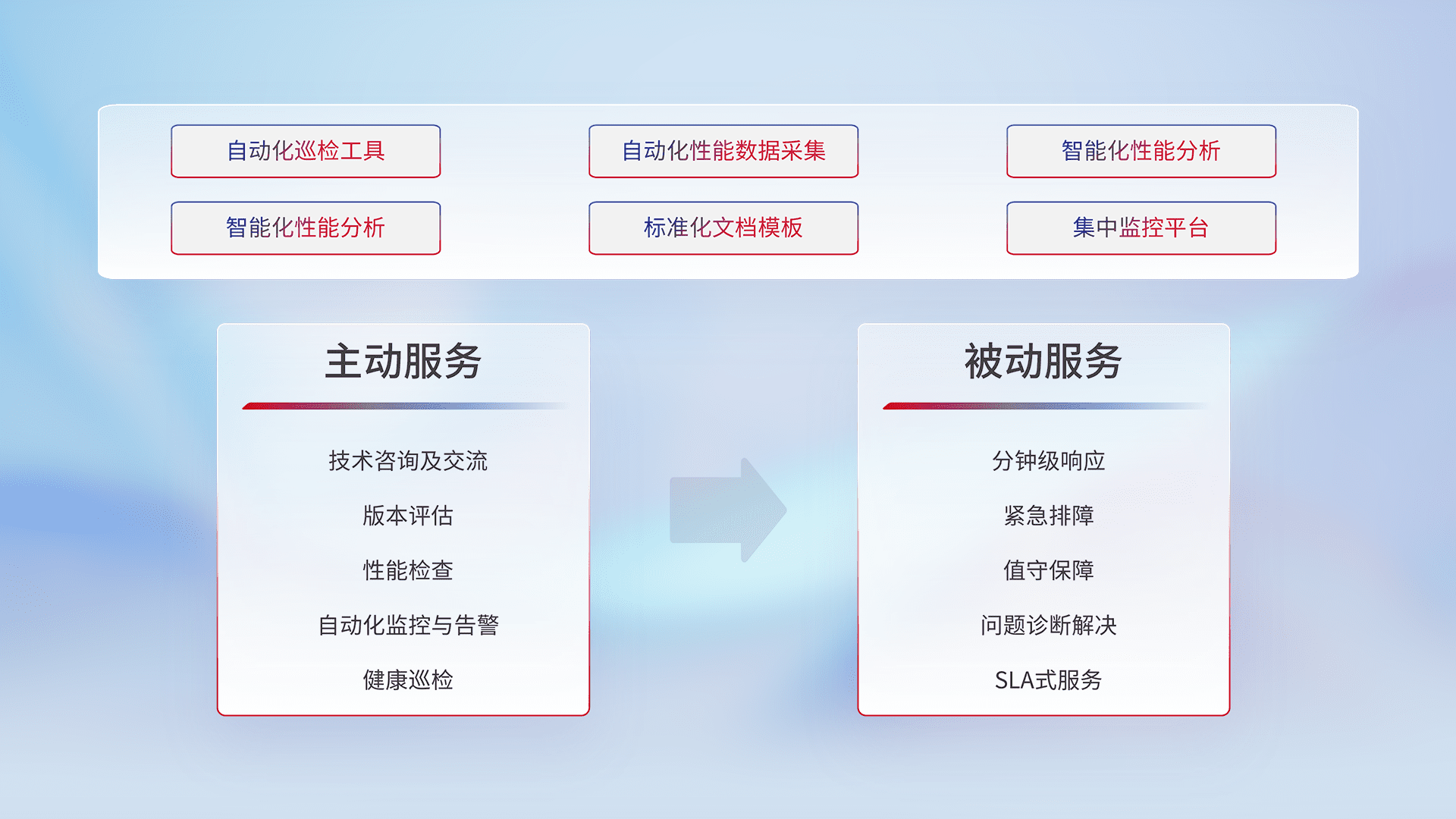 智能化工具和标准化文档,,,保障服务质量,,,提供主动服务(包含技术咨询、、、、版本评估、、、性能检查、、、自动化监控与告警、、健康巡检)和被动服务包含(分钟级响应、、、紧急排障、、、、值守保障、、问题诊断解决、、、SLA服务)。。